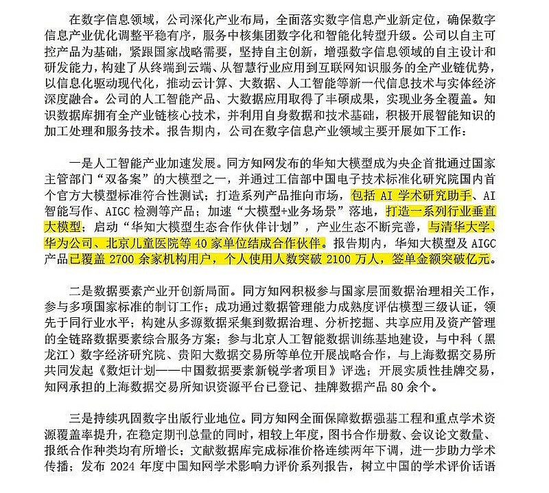 公司与华为合作的AI大模型已开发了多款垂直模型,应用于多个细分领域,包括安检、法律、政务、医疗医药、教育等,其2024年年报显示订单已过亿;另外,利用旗下同方知网这一优质数据库,公司也打造了用于科研的相关AI大模型。