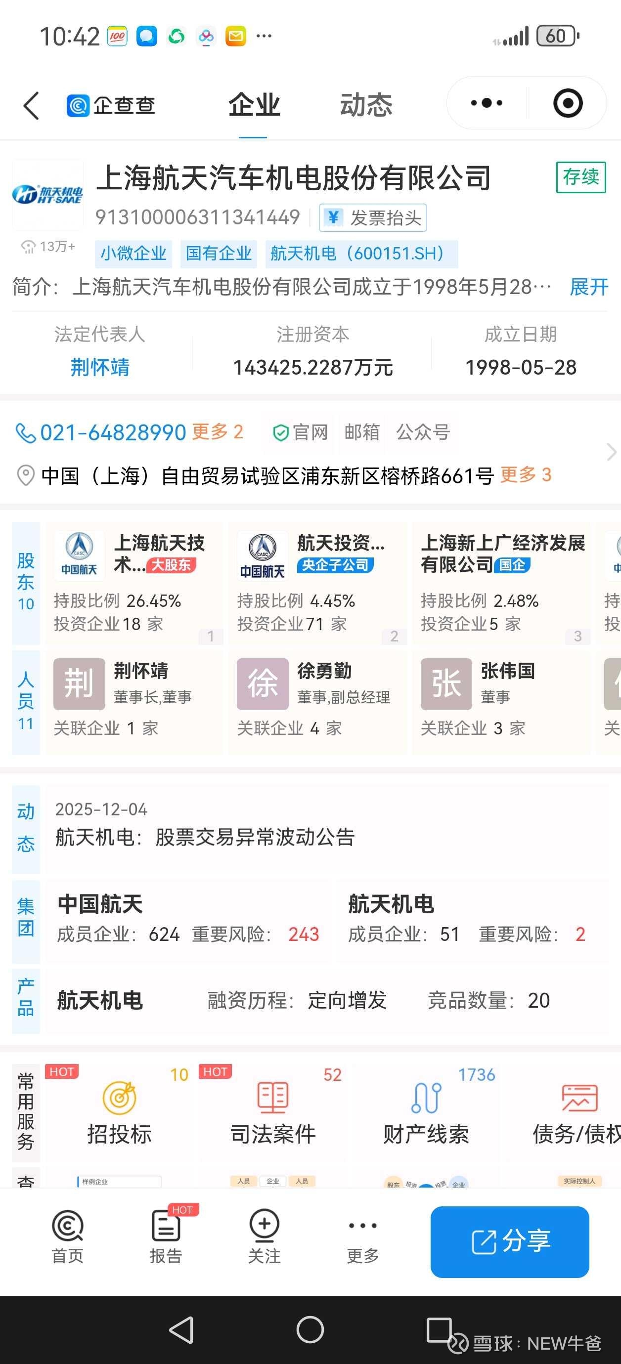 高管换血: 2025年12月,公司任命了李建华为新任总经理。他拥有深厚的八院科研背景,这种“空降”高管往往是大股东为即将进行的重大资产重组做管理层铺垫。