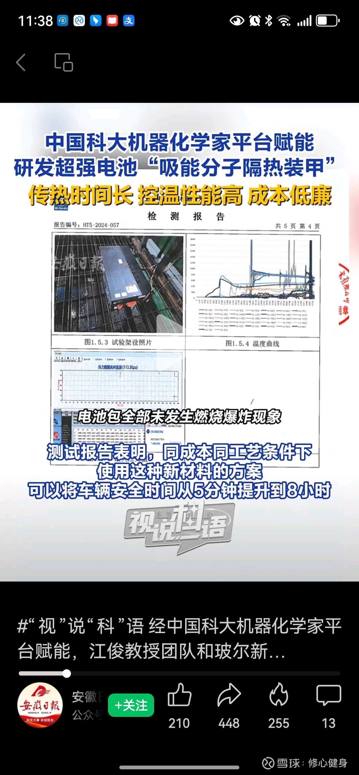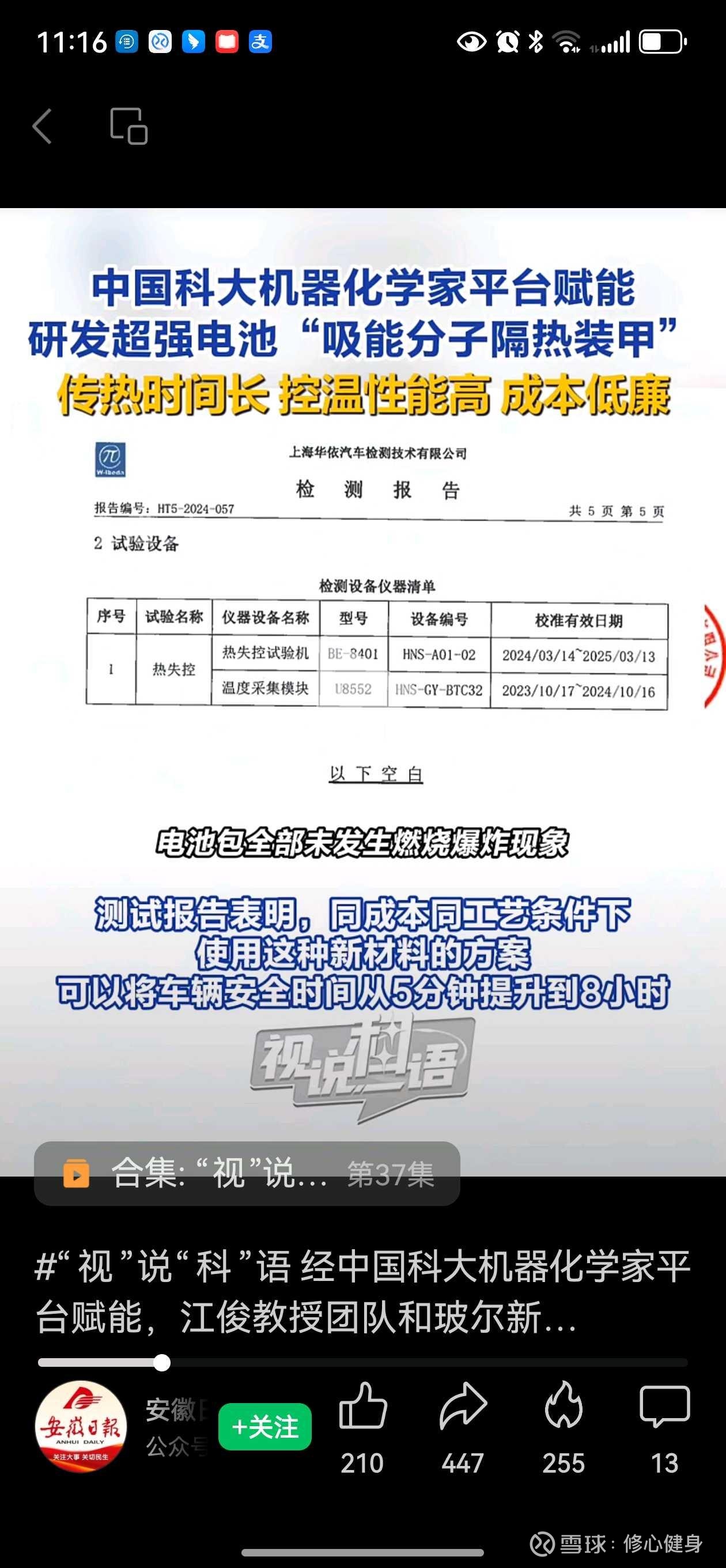 下面四张图是上海华依对“薄型相变高温隔热阻燃材料”在新能源电池隔热性的检测,对比了市面上130余种同类型材料,得到的结果:电池包全部未发生燃烧爆炸现象,车辆安全性以5分钟提升到8小时!(截图于安徽日报公众号)