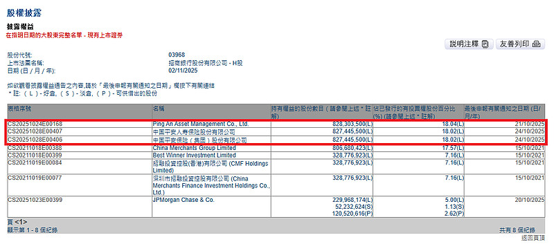 从下面港交所披露的信息看,同属平安集团的三家实体(Ping An Asset Management Co., Ltd.,中国平安人寿保险股份有限公司,中国平安保险(集团)股份有限公司),分别持有 8 亿招商 H 股。这是不是说,平安集团一共持有 24 亿招商 H 股呢?