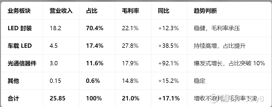 那么从上面可见,它的优势也比较明显,基本盘稳固:背光 LED全球龙头,客户与规模壁垒深厚,现金流稳定。增长曲线清晰:车载 LED高增,光通信爆发,形成 “一稳两增” 格局。当然现在抄的火热的模块我们的等会讨论。