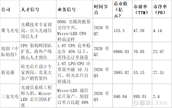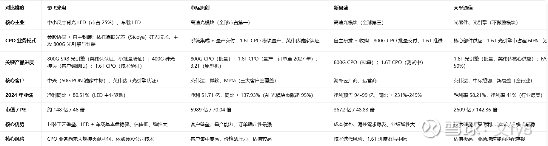 头部挤压:中际旭创、新易盛等已形成芯片 + 模块 + 客户全栈壁垒,聚飞 / 熹联必须抱团才能在 CPO 赛道立足。