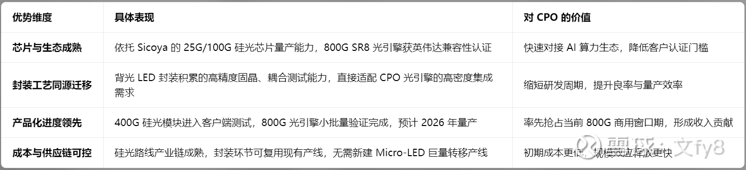技术协同:将 LED 封装的高精度固晶、耦合测试能力复用至硅光 CPO 封装,形成差异化竞争力。