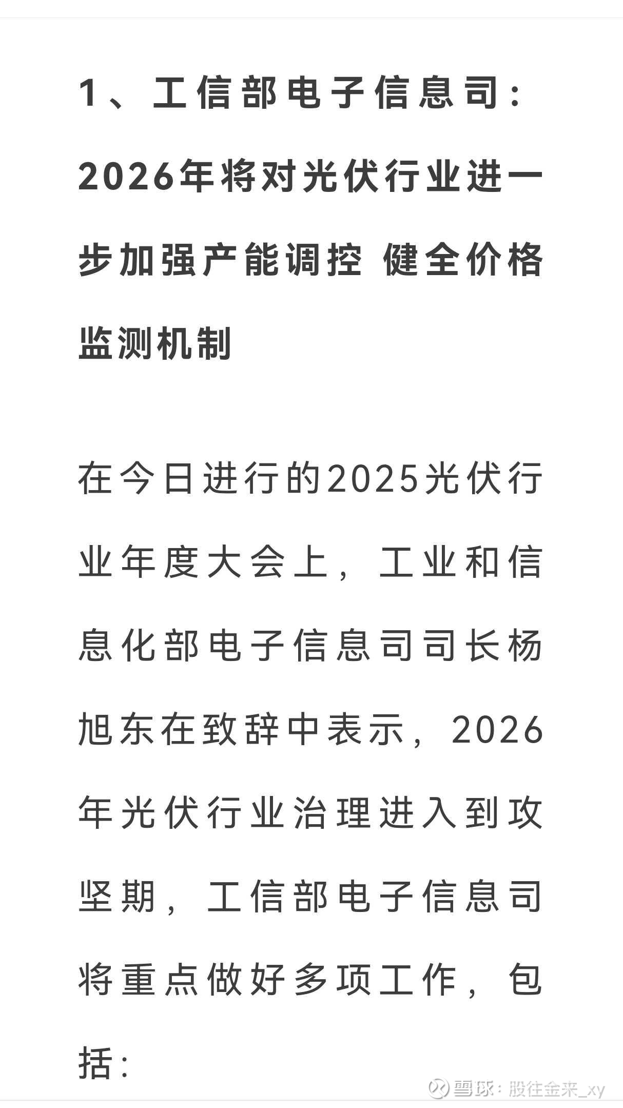 在今日进行的2025光伏行业年度大会上,工业和信息化部电子信息司司长杨旭东在致辞中表示,2026年光伏行业治理进入到攻坚期,工信部电子信息司将重点做好多项工作,包括进一步加强产能调控,深入推进构建全国统一大市场的要求强化光伏制造项目的管理,以市场化法治化的手段,推动落后产能的有序退出,加快实现产能的动态平衡;要健全价格监测机制,深入贯彻《反不正当竞争法》,严格打击价格违法,虚假营销等各种违法违规行为,遏制低价无序竞争,重点关注价格异常企业,加强产品质量监督和抽查。对于存在质量不达标,功率虚标,侵犯知识产权等行为的企业,我们加强监测与跟踪处置。同时,会强化创新驱动、完善标准体系,以及督促行业进一步加自律等。