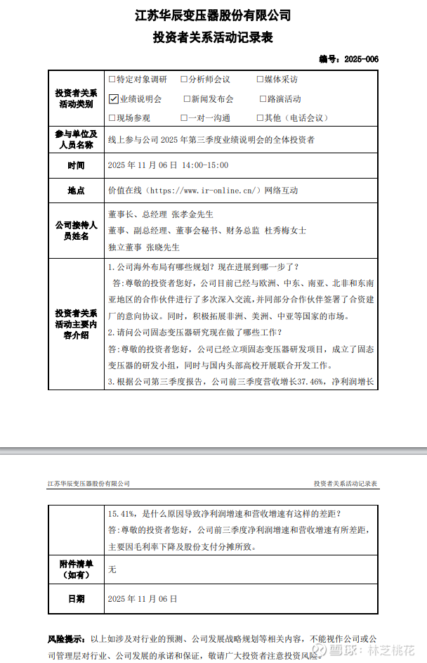 江苏华辰:公司正积极开展关于固态变压器的调研工作,目前正系统评估自身在设备、产线与供应链等方面的适配性与准备度。公司目前已经与欧洲、中东、南亚、北非和东南亚地区的合作伙伴进行了多次深入交流,并同部分合作伙伴签署了合资建厂的意向协议。同时,积极拓展非洲、美洲、中亚等国家的市场。公司上市募集资金投资的新能源变压器项目是原有产能的1.5倍,而且10月份已经投产,2026年股价100元也才160亿市值,不过分!