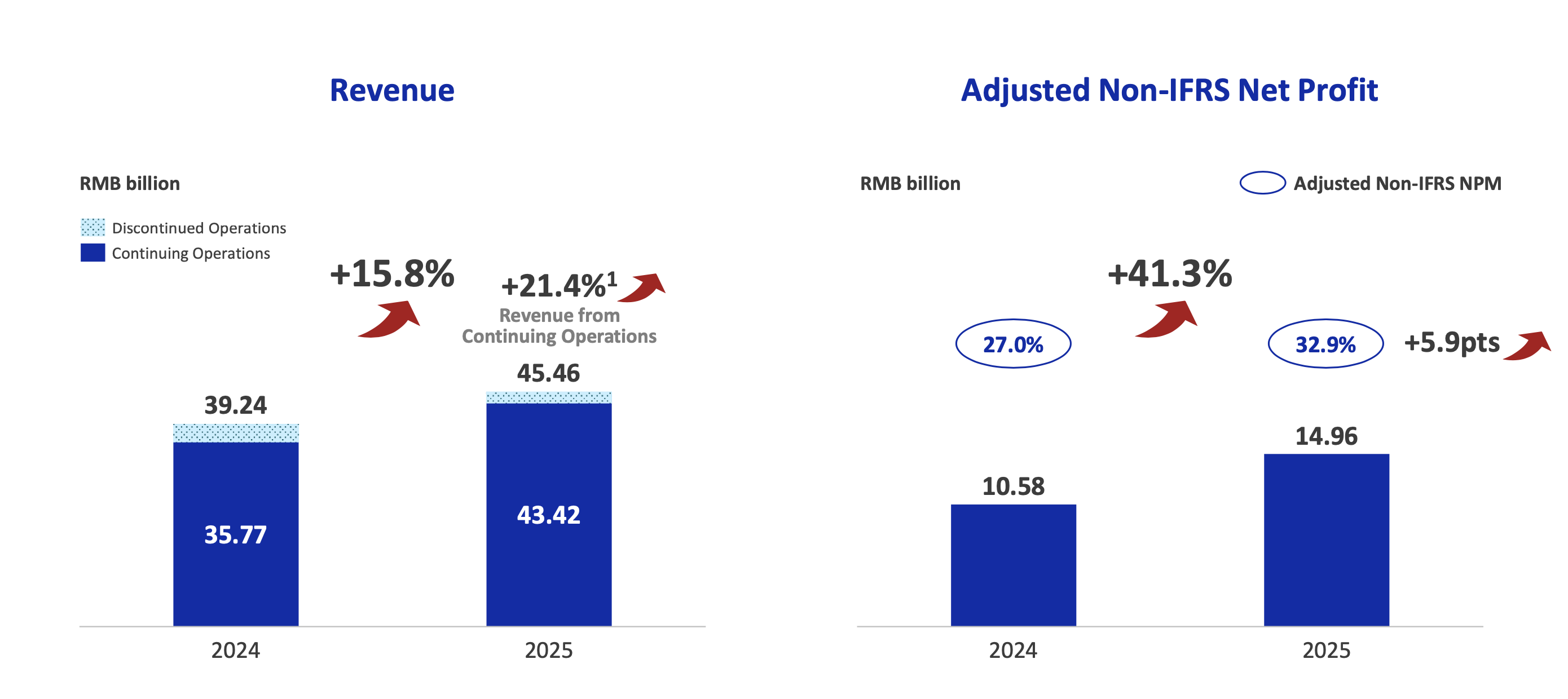 non-IFRS net profit(这个净利润扣除了股权激励等所有非经营性的损益)目前来看149.6亿元,同比暴增41.3%,利润率 +5.9%