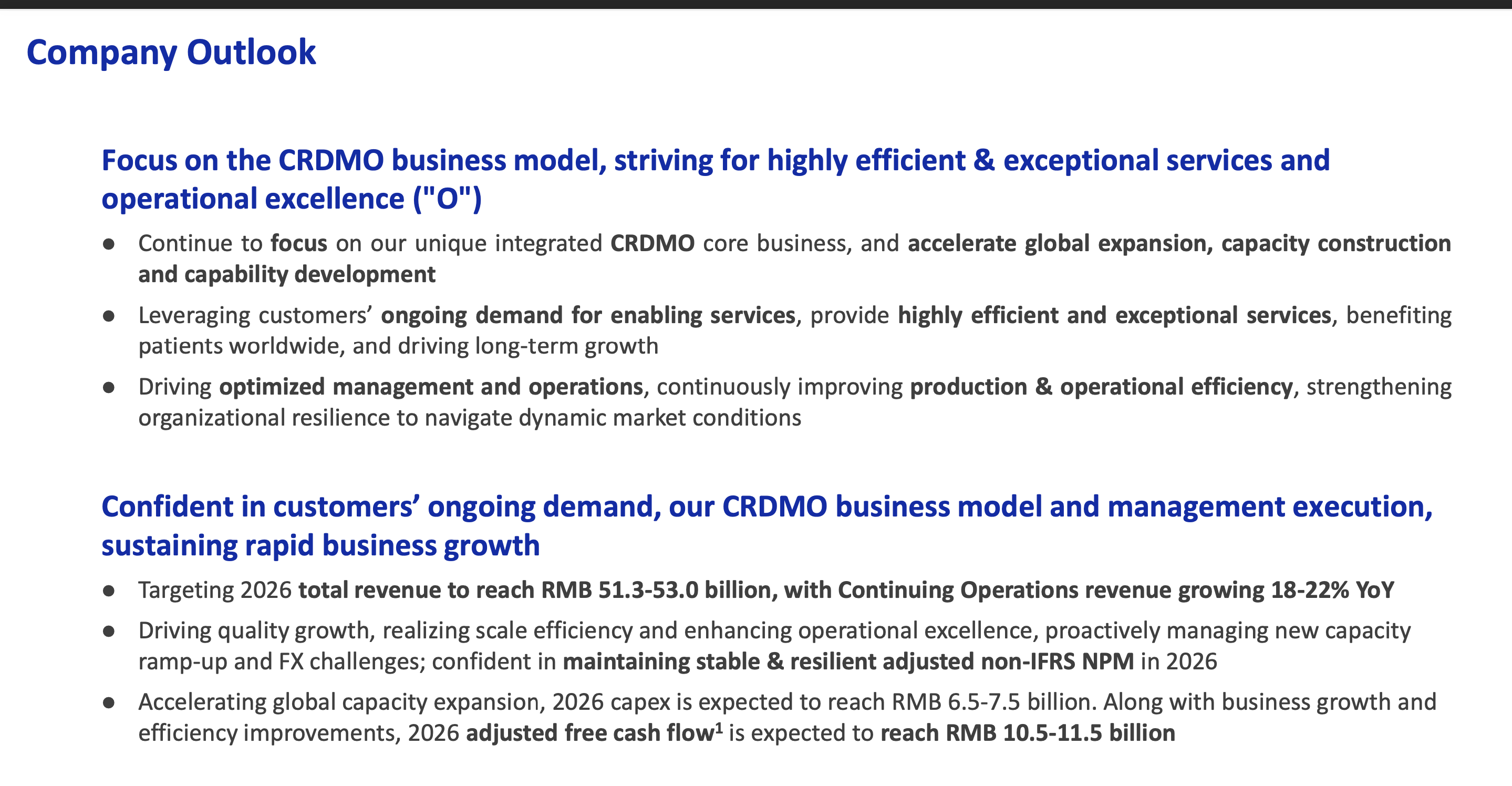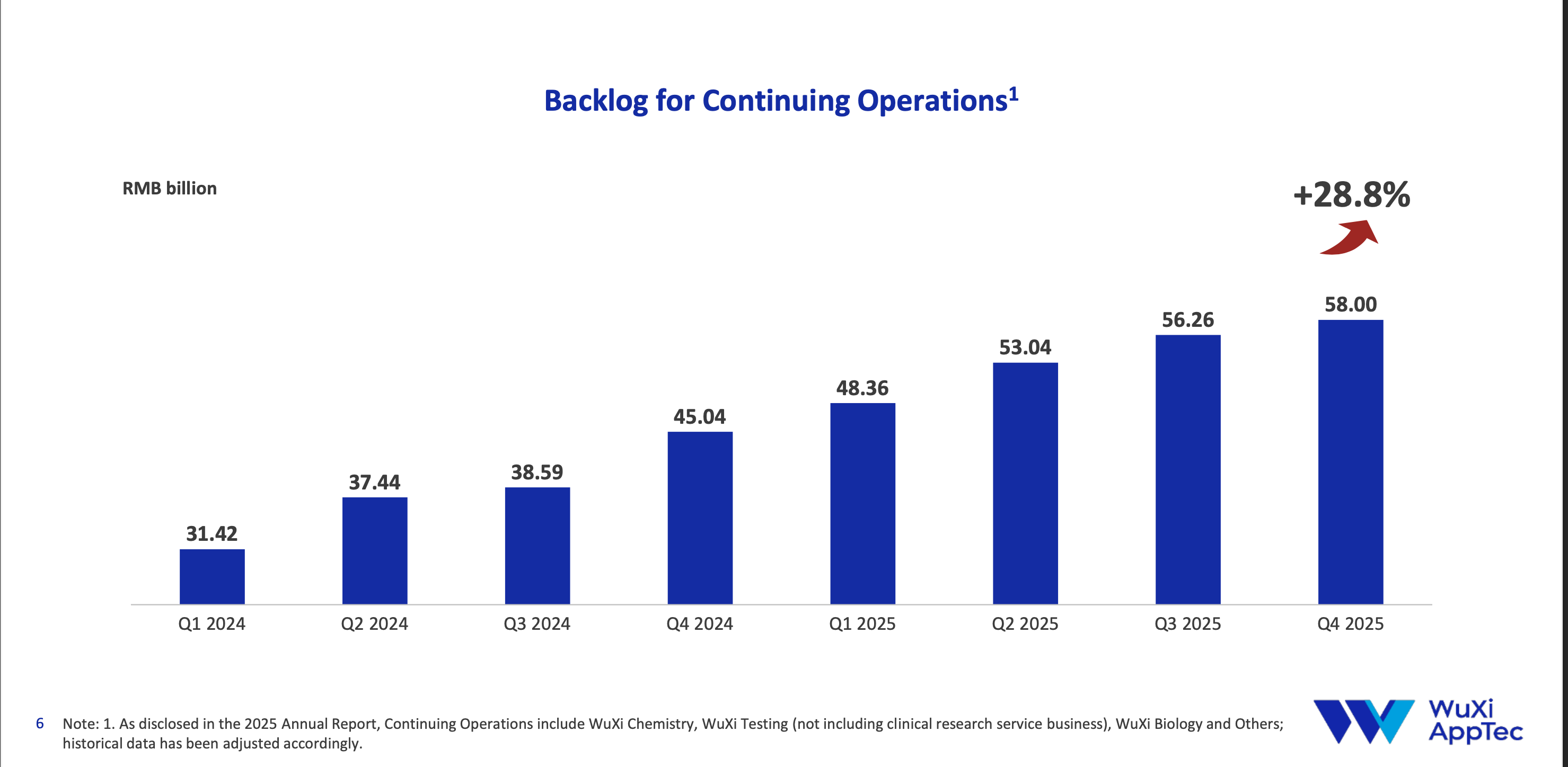 这张图是最关键的,剔除掉出售的临床cro后,调整后的订单依然还在增长(第三季度从598亿修正到562.6亿)。大家一定要对公司在手的订单异常敏感,因为国内机构对药明的定价一直是新增订单其实已经严重不足(因为法案问题美国客户砍单),全部都是老的订单在顶着,而随着时间的推移,这个预测的根基一直在动摇。