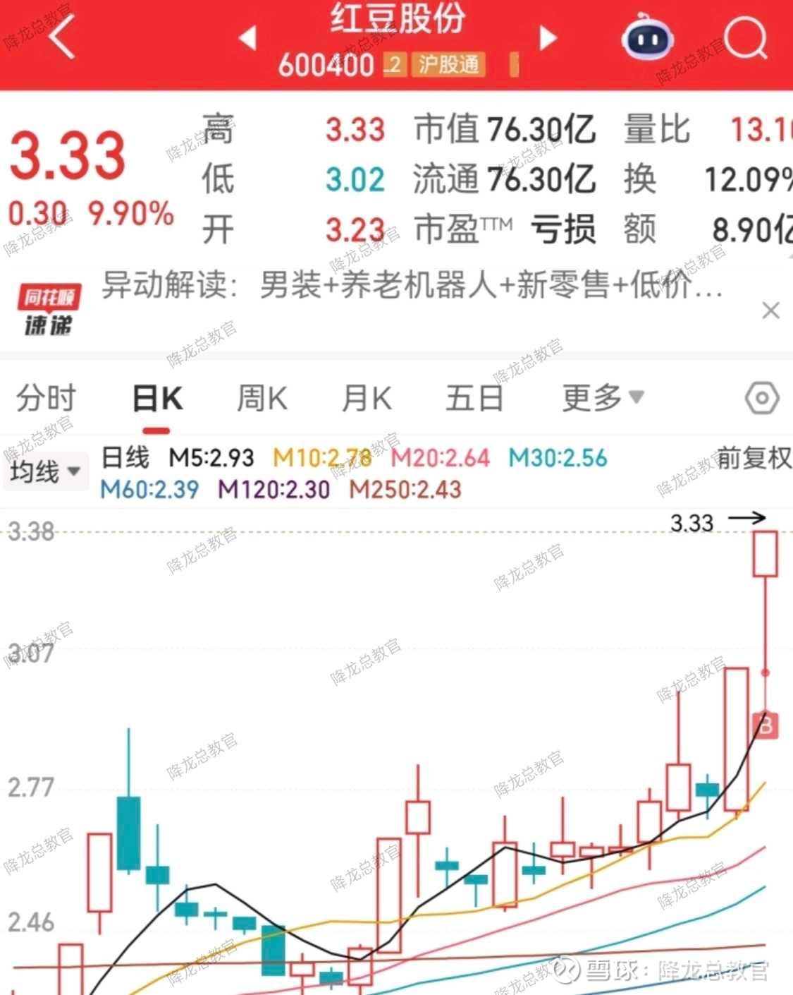 盘中3个点吸入红豆股份收盘涨停板暂盈利7%个点