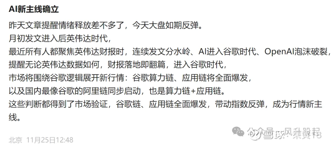 11.19-11.25,大盘转折点附近,连续发文指出,英伟达财报落地后,即进入谷歌时代,AI将围绕谷歌链展开新行情。