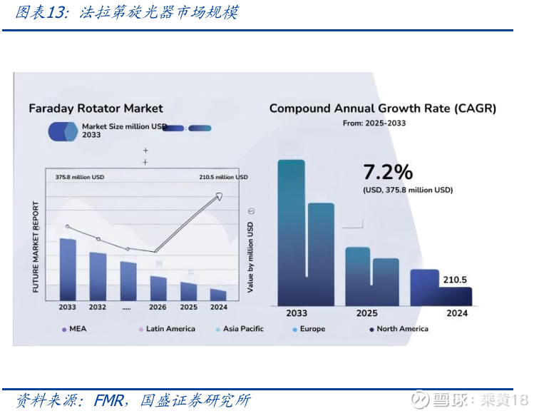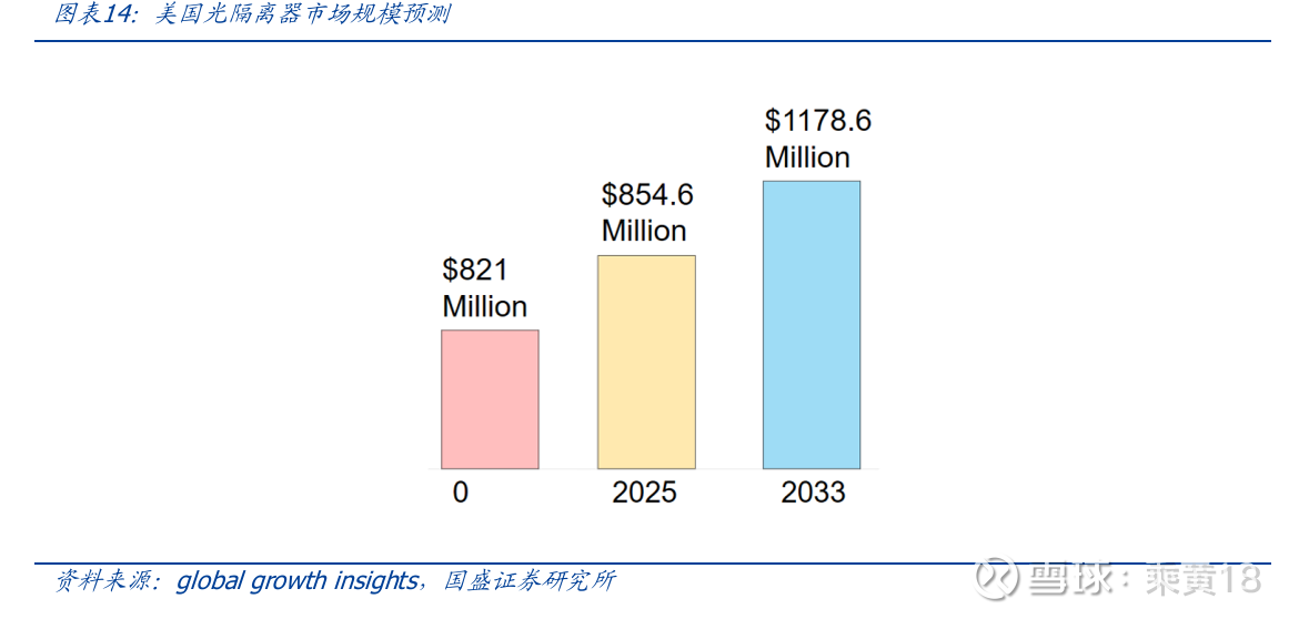 高需求下光隔离器未来前景广阔。从应用场景看,政策与AI发展趋势共振驱动数据中心 向高密度、多通道、高速率方向加速演进,对上游光隔离器等光器件需求增加;而由于上游原材料如法拉第旋光片等限制,布局此领域企业有望凭借其稀缺性、充足的产能与 技术壁垒构建优势,在受益于市场需求增加的同时享受涨价逻辑。根据第三方机构global growth insights 预测,美国光隔离器市场规模将从2025年的8.5亿美元增长到2033的 11.8 亿美元,年复合增长率为4.1%
