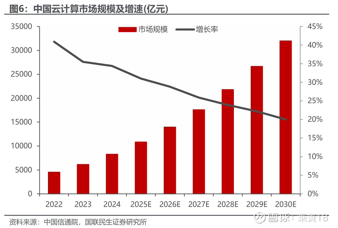 国内云计算市场延续了高速增长的发展势头。根据中国信通院的统计数据, 2024 年我国云计算市场规模达到8288亿元,较2023年增长34.4%。其中,公 有云市场规模为6216亿元,同比增长36.6%;私有云市场规模为2072亿元,同比增长 29.3%。未来,随着人工智能等技术与云计算的深度融合与创新,云计算的市场边界将持续拓展,预计到2030年我国云计算市场规模有望突破3万亿元。