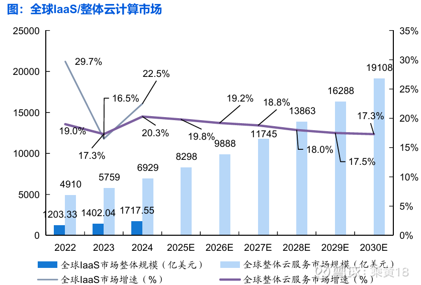 2024年企业云端改造需求活跃,同时受大模型训练/推理/微调所产生的基础设施产品需求推动,据Gartner数据, 全球IaaS市场增速上探至22.5%,较2023年提升6.3pct,市场规模达到1718亿美元。未来几年,随着AI大模型训 练、推理对IaaS消费的拉动,以及应用类模型服务在SaaS侧不断完善,对云计算的需求持续增加;根据中国信通 院数据,预计到2030年全球云计算市场规模将接近2万亿美元。
