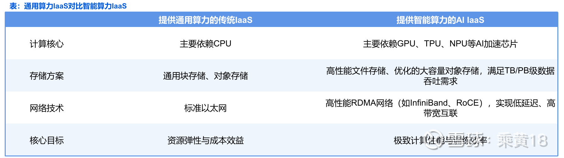 AI IaaS(人工智能基础设施即服务)在基础设施资源方面与传统通用IaaS有显著差异,其核心在于专为AI大模型的训练与推理 需求进行了技术优化,尤其针对计算、存储和网络三大基础资源: