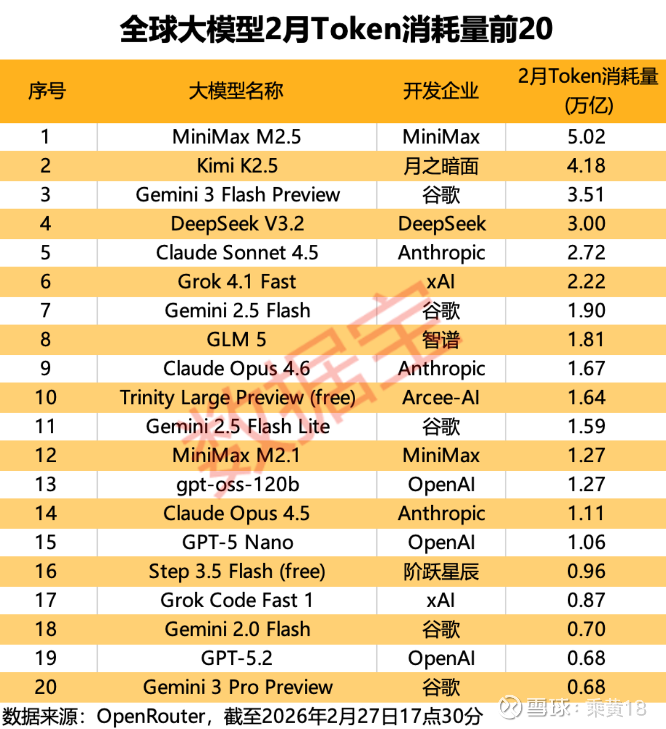 其中,MiniMax M2.5以超过5万亿的Token消耗位居全球榜首;Kimi K2.5紧随其后,2月Token总消耗量超过4万亿;DeepSeek V3.2、GLM 5分别位列第四、第八位。这些头部国产大模型,普遍聚焦于代码能力与智能体(Agent)自动化任务的能力提升。