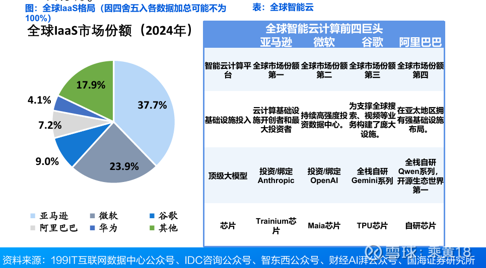 据Gartner,2024年全球IaaS市场前五大厂商仍然为亚马逊(37.7%)、微软(23.9%)、谷歌(9.0%)、阿里巴巴(7.2%) 和华为(4.1%),合计占据82.1%的市场份额,格局与2023年几乎一致。