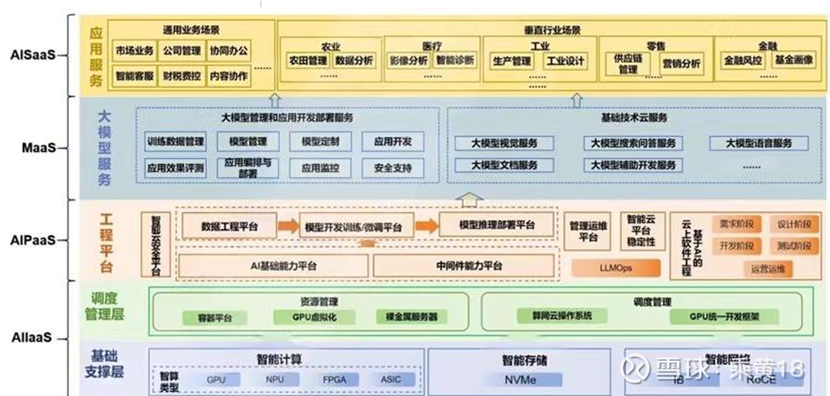AI-IaaS(基础设施层)、AI-PaaS(开发平台层)、MaaS(模型服务层)以及AI-SaaS(AI应用层)