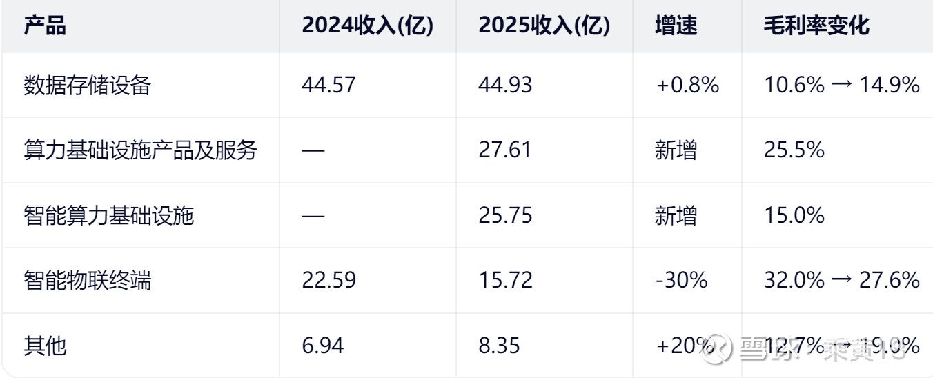 可见,算力业务完全是25年新增,存储业务毛利率涨了,收入没涨,其实是存储涨价,公司执行惜售策略,存货积压待2026年释放,这块我们后面聊。