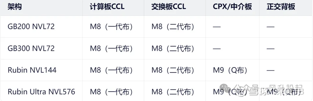 M9/M10材料方案未定论: NV Rubin最终用Q布+碳氢还是PTFE方案,直接影响Q布和二代布的需求分配。目前M9正交背板验证反复,实际用量仅LPU产品52层PCB采用Q布版本。M10方案(Df万3.6-万5)预计2028年量产,PTFE vs 碳氢尚未定论。