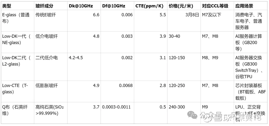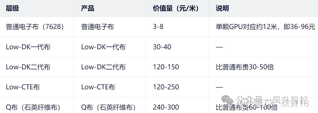 关键点:虽然单位价值量不高,但AI服务器PCB层数从传统的14-24层升级到20-30层甚至52层(LPU),电子布用量成倍增加。而且越高端的布越贵,价格差距可达100倍。
