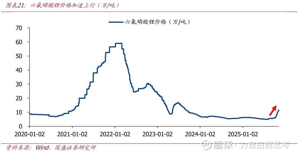 根据ELEMENTS数据,电解液占电池总成本仅4%(正极51%、制造24%、负极12%、隔膜7%),而六氟磷酸锂占电解液成本43%,因此穿透到电池层面成本占比不足2%。由于六氟磷酸锂下游成本敏感性低,下游涨价容忍度高,而受制于危化品属性扩产周期较长,因此一旦出现供需紧缺,价格弹性大。从历史来看,2022年曾达到59万/吨的价格高点,较2020年8月起涨前6.95万/吨上涨超8倍。