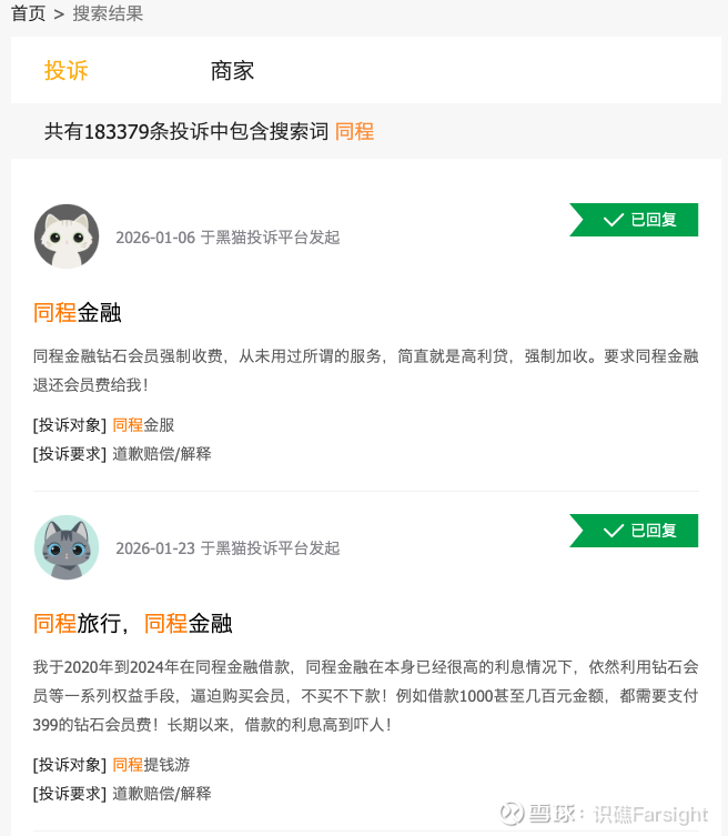 在消费者服务平台黑猫投诉以“同程”为关键词检索,可以发现约18.34万条投诉,诸多用户均控诉称,同程旅行存在杀熟、隐私泄露、虚假宣传等问题。