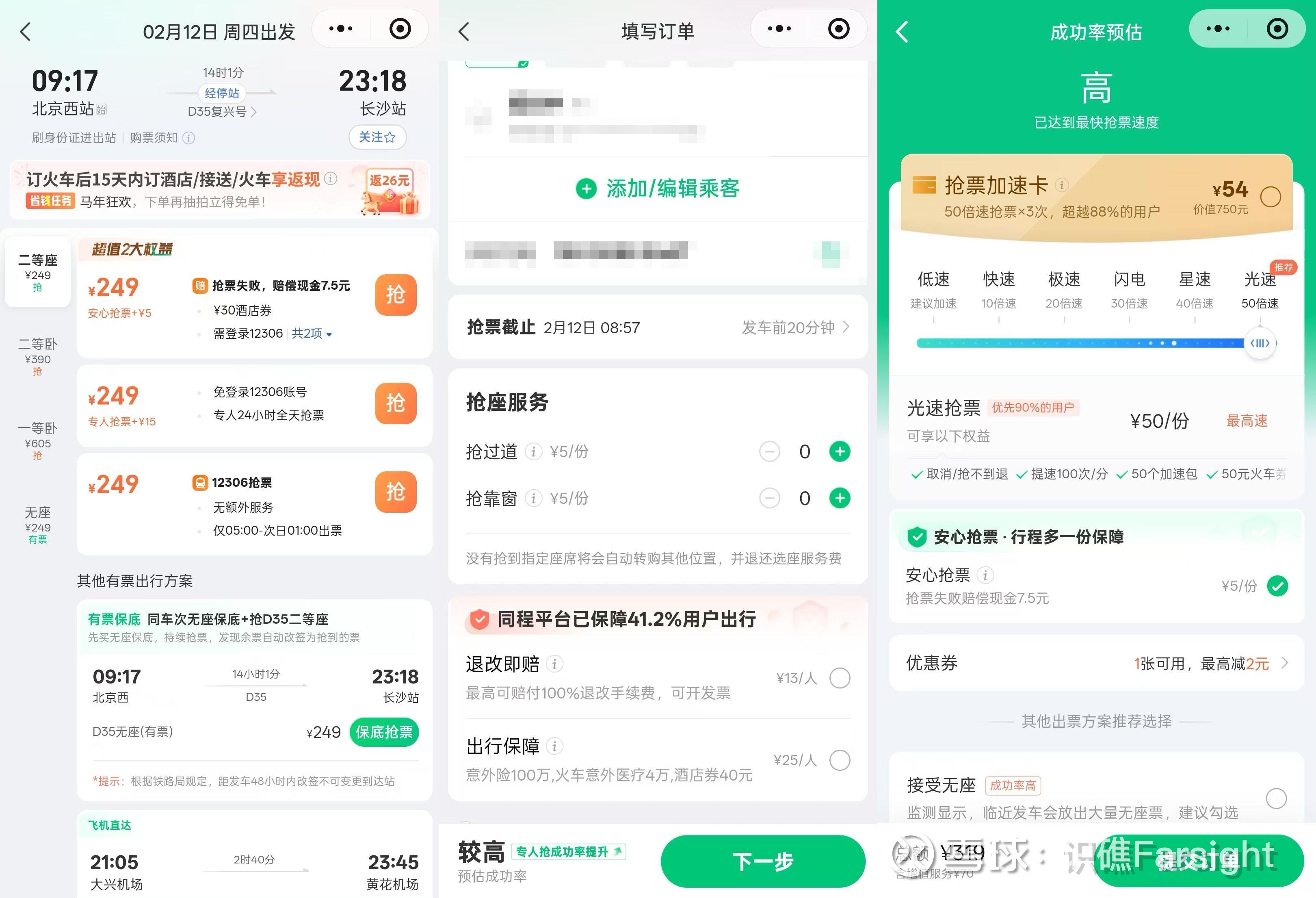 识礁Farsight在同程旅行搜索2月12日北京西站前往长沙站的动车D35,发现部分座次已售罄。同程旅行平台则上线了“付费抢票”服务。