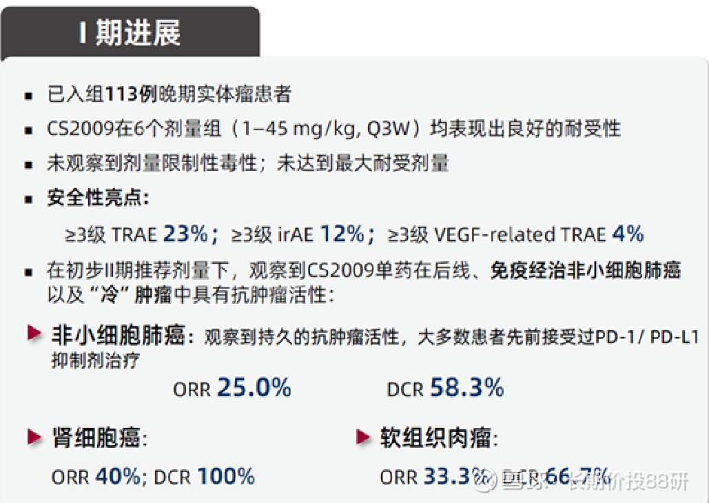 总体耐受性 (TRAE 23%):对于晚期实体瘤(尤其是后线治疗)患者,约 1/5 的患者出现 3 级以上不良反应,属于非常可接受范围。对比“O药+Y药”双免疫联合方案(≥3级 TRAE 约33-50%),CS2009 的耐受性有明显改善。