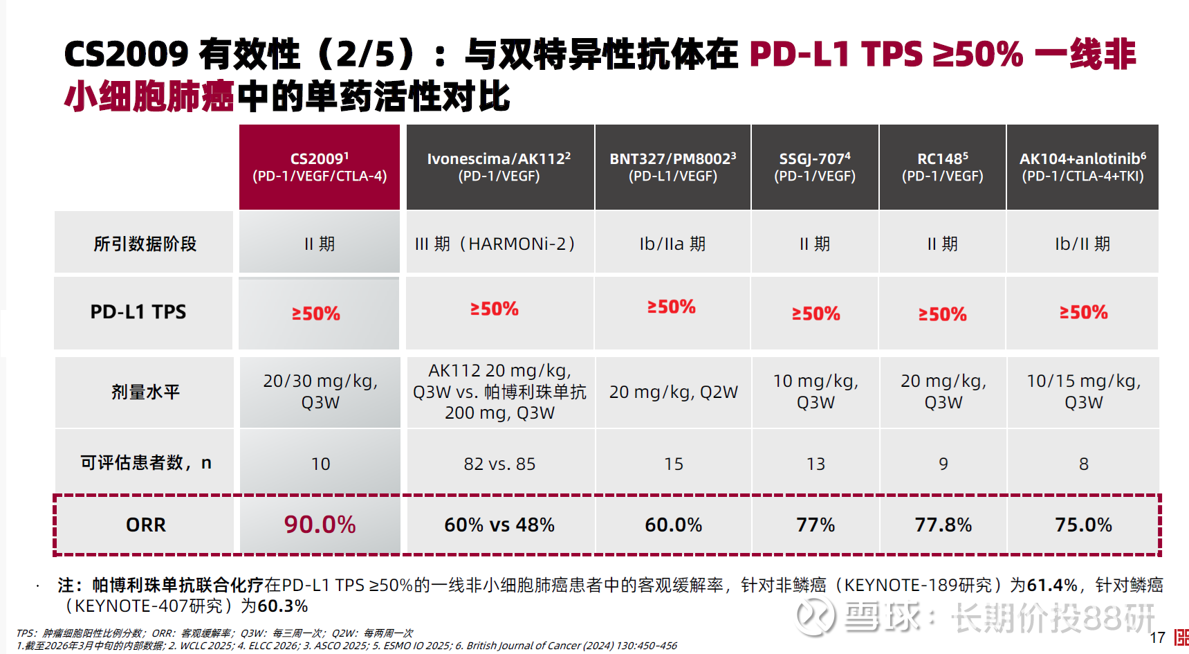 我们知道II期是概念验证,确认初步疗效信号。基石药业采用单药疗法在PD-L1TPS≥50%患者中考察,排除了联合用药的干扰,ORR达到90%,虽然只有10例患者,但9例PR,1例SD的SQ患者肿瘤缩小也达17%。为什么 90% ORR 很炸?