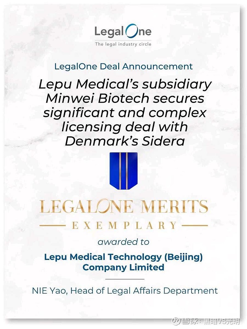 旗下控股子公司民为生物与丹麦 Sidera 达成 MWN105 注射液许可交易”获 LegalOne Merits (典范) 评级