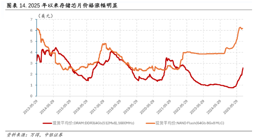 第二,价格端持续上涨:2025 年初以来,存储芯片DRAM、NAND价格已经分别上涨 227.6%、42.7%。