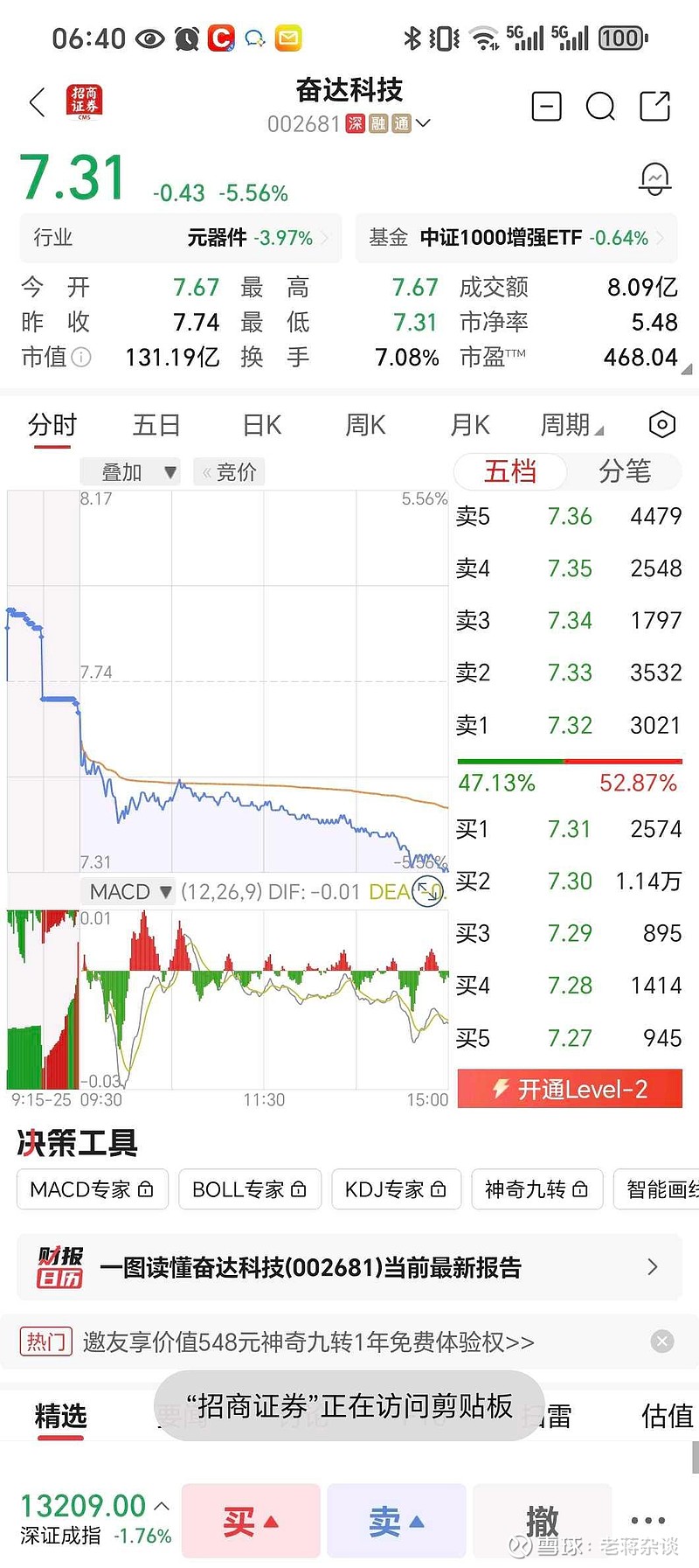 奋达科技(002681)9月26日表现疲弱,收盘报7.31元,下跌5.56%,成交额8.09亿元,换手率7.08%。资金面上,主力资金净流出1.51亿元,占总成交额18.62%,而散户资金净流入1.58亿元,呈现主力大幅撤离、散户接盘的分化态势。该股已连续3日下跌,区间累计跌幅达5.03%。其所属的消费电子板块当日跌幅为3.02%,板块整体资金净流出109.96亿元,加重了个股抛压。尽管公司近期公告与清华大学在机器人灵巧手合作取得进展,但2025年中报显示营收同比降10.68%、净利润降80.16%的基本面压力,叠加主力近5日累计净流出2.53亿元的资金面弱势,共同导致当日大幅回调。