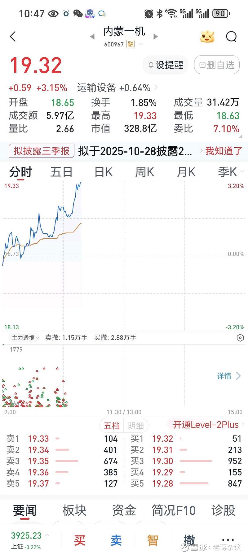 2025年10月10日,内蒙一机(600967)表现强势,收盘报19.32元,上涨3.15%,成交额5.97亿元,换手率1.85%。该股当日低开高走,盘中最高触及19.33元,显著跑赢运输设备板块(+0.64%)及大盘(上证指数-0.22%)。量比达2.66显示交投活跃,买盘在19.28-19.32元区间挂单密集,反映资金承接力度较强。