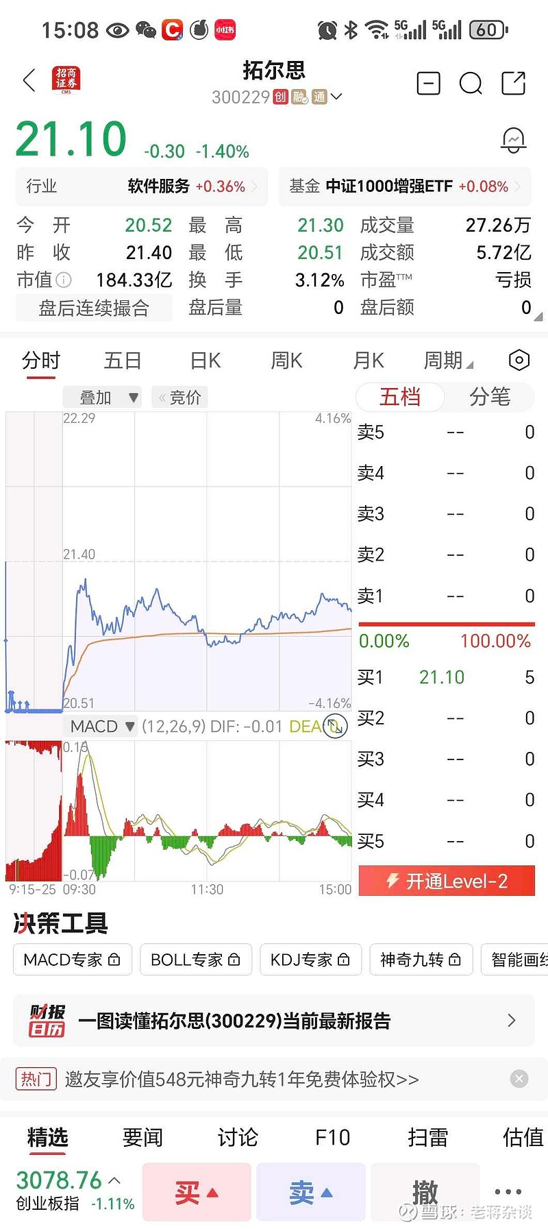 2025年10月13日,拓尔思收盘报21.10元,下跌1.40%,表现明显弱于所在软件服务行业(+0.36%)及创业板指(-1.11%)。从技术面看,MACD指标DIF(-0.01)下穿DEA(0.14),形成死叉信号,短期动能转弱。盘口数据显示买一价位21.10元仅5手挂单,卖盘挂单空白,反映市场交投清淡,资金观望情绪浓厚。股价全天在21.10元附近弱势震荡,成交量能不足。