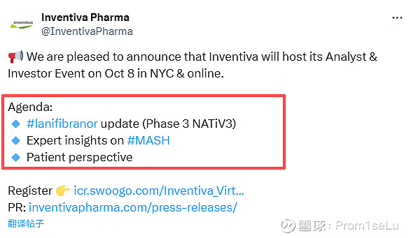 2、Inventiva Pharma (IVA)将于10月8日在纽约和网上举办分析师与投资者活动,议程重点 :更新mash三期 lanifibranor(第3阶段 NATiV3)进展。
