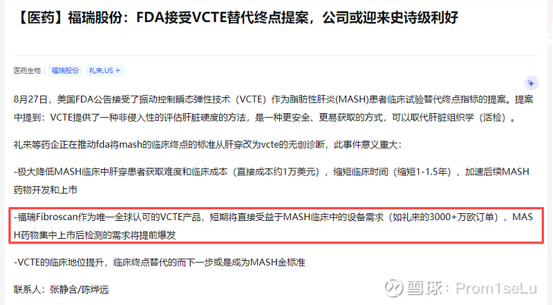 另外根据礼来三期的试验设计,FDA最终接受VCTE成为mash终点的确定性接近100%。(对于福瑞唯一性存疑的老师么建议翻看专利以及FDA报道的详细说明,不过多阐述)