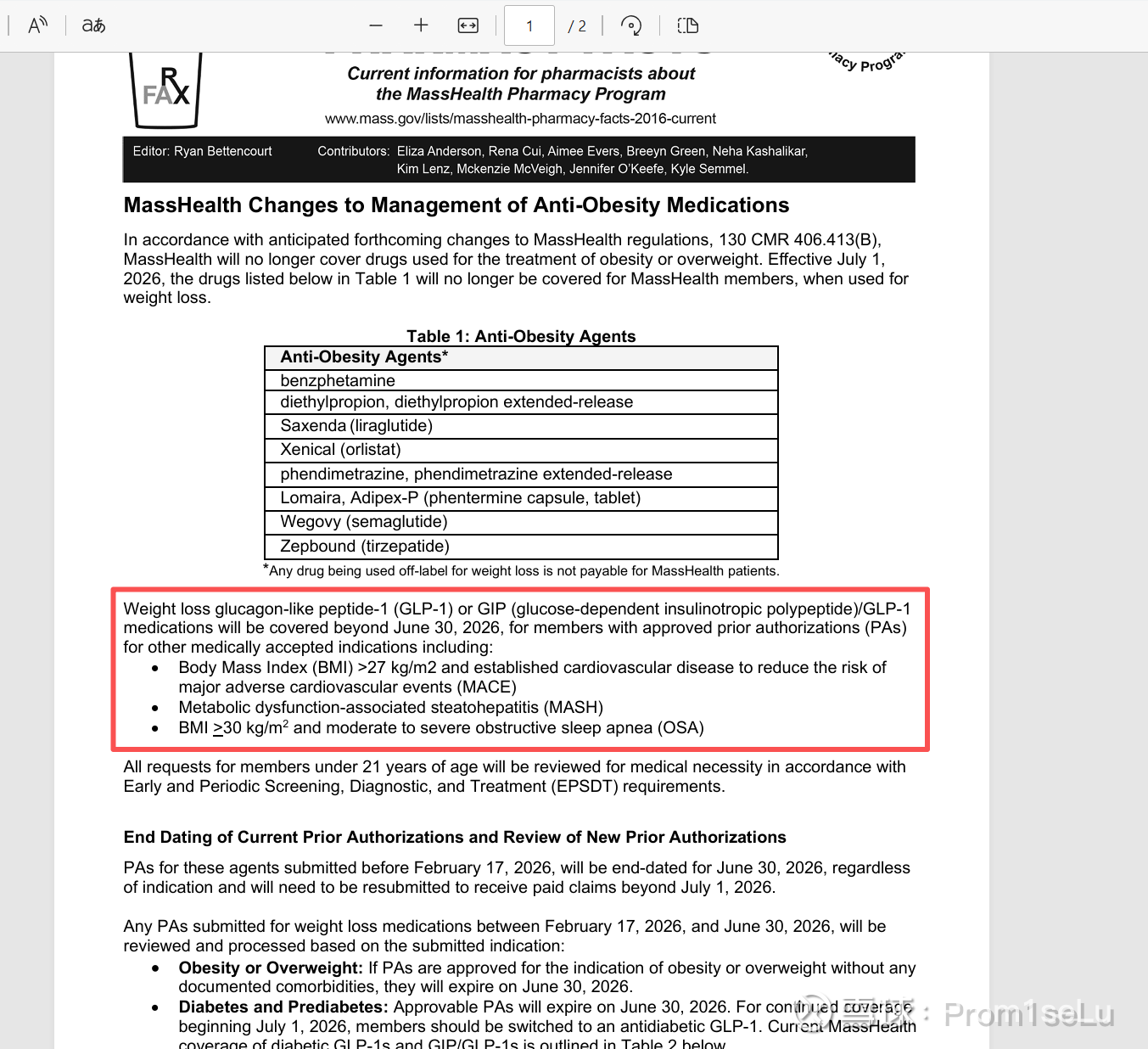 1、马萨诸塞州医保MassHealth 文件的核心调整,26年7月1日起取消 GLP-1 等抗肥胖药物减重适应症的医保报销(单减重不再支持医保报销),仅保留 3 类非减重合规适应症的报销资格,三种分别心血管疾病(BMI >27 + 心血管病)、MASH(脂肪性肝炎)、OSA(BMI >30 + 中重度OSA),明确了 MASH 是这类高值药物医保可覆盖的合法场景。