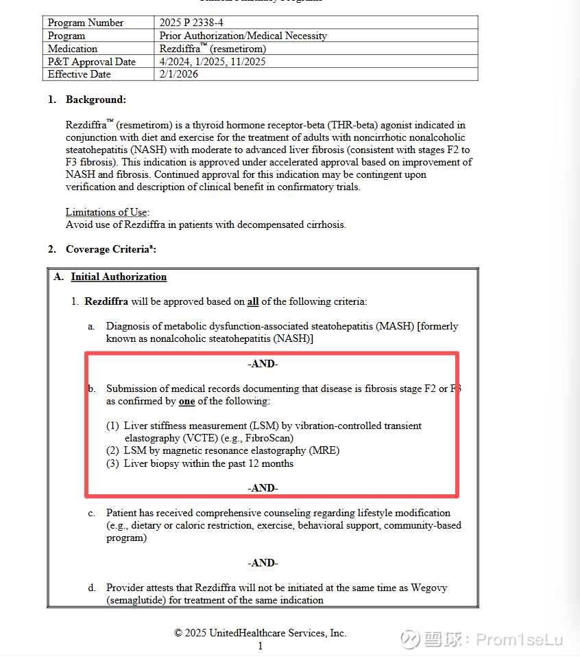 2、根据UnitedHealthcare 最新文件(UnitedHealthcare 是美国最大的商业医疗保险公司之一),专门针对 MASH 专用靶向治疗药物 Rezdiffra(resmetirom)制定的医保预授权规则,明确了 MASH 治疗的医保准入核心标准。想用 Rezdiffra(MASH首款药),必须先证明你有“F2–F3纤维化”,且只认用FibroScan/MRE/活检这三种手段检测数据。(这三种检测手段利弊不再展开细说,fibroscan优势非常明显) 附加: 文件索引链接