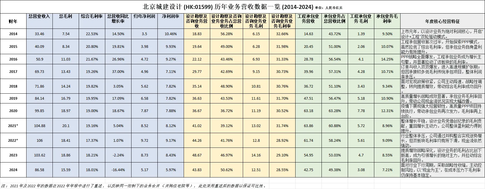 北京城建设计 (HK:01599) 历年业务营收数据一览 (2014-2024) 单位:人民币亿元