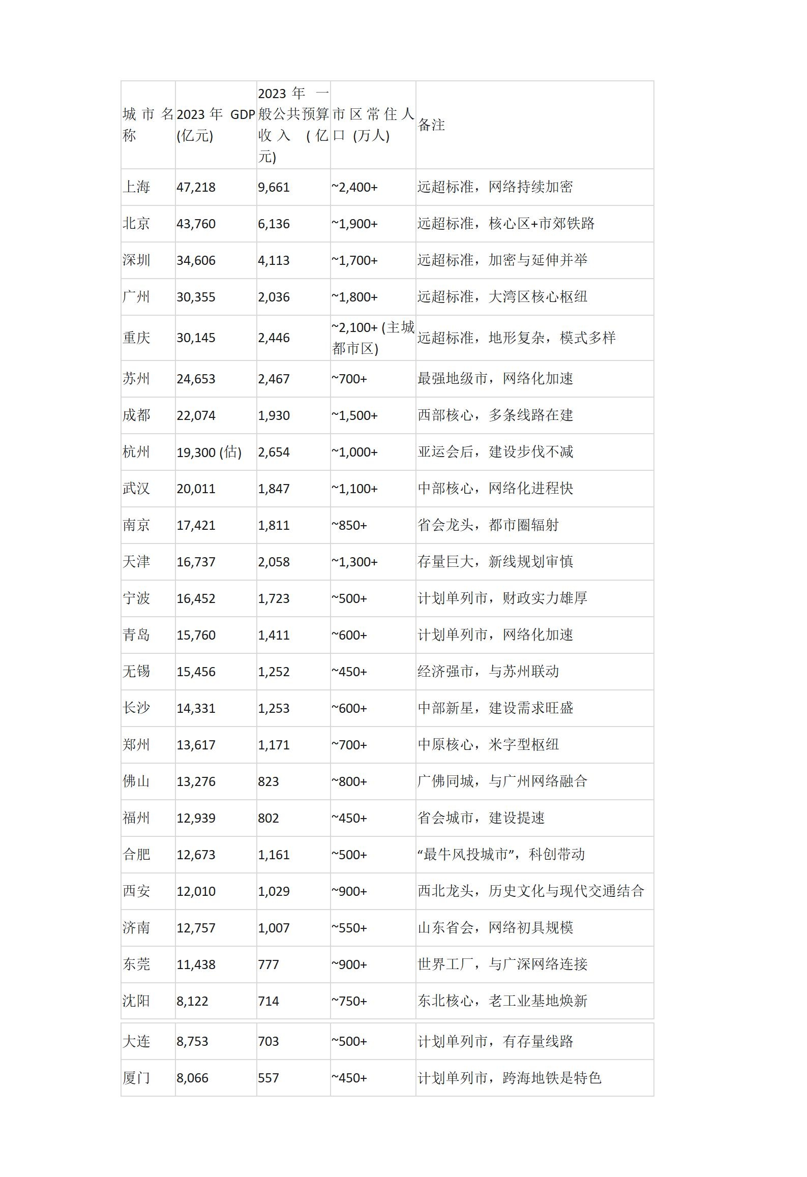 这些是中国城市金字塔的塔尖。它们不仅是经济重镇,也是人口高度聚集的中心,拥有最强的财政实力来支撑地铁这种高成本的基建项目。