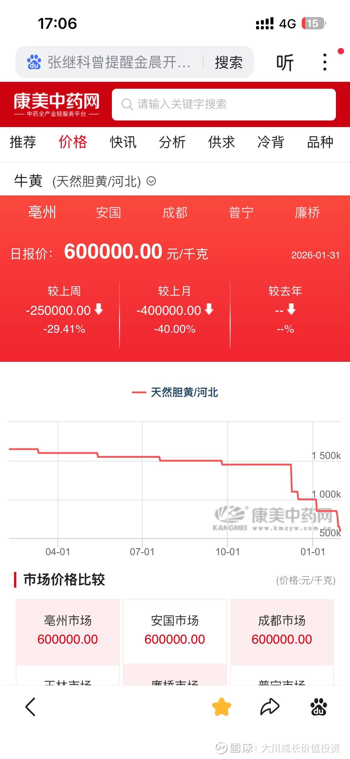 国内天然牛黄价格又继续下行,当前主流报价已跌至60万元每公斤。据说首批阿根廷牛黄税后成本在50-55万元每公斤,国内牛黄也会进一步下探至这个水平。中长期更有望回归炒作前30-50万元/公斤的合理价值中枢。如果剔除短期高价库存的问题,就目前天然牛黄每公斤降价110万的情况(170万跌至60万),每粒片仔癀锭剂(含0.15克牛黄)可节约成本165元。$上证指数(SH000001)$ $同仁堂(SH600085)$ $片仔癀(SH600436)$