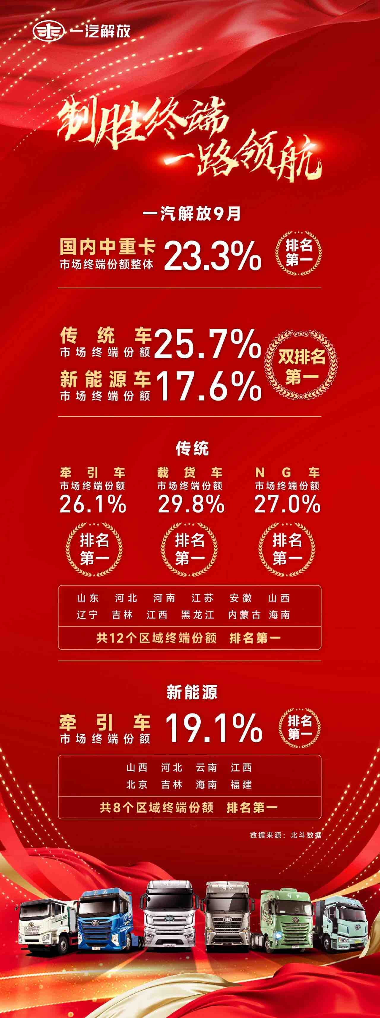 $一汽解放(SZ000800)$ 2025年9月,一汽解放凭借传统中重卡销量1.37万辆, 市场份额25.7%,以及新能源中重卡销量0.38万辆,市场份额17.6%,成为当月国内中重卡终端市场唯一“双冠王”!在传统与新能源两大领域均占据榜首位置。乐观情景:若四季度政策刺激超预期+海外市场突破,全年销量或达28-30万辆(完成目标的85%-90%)。