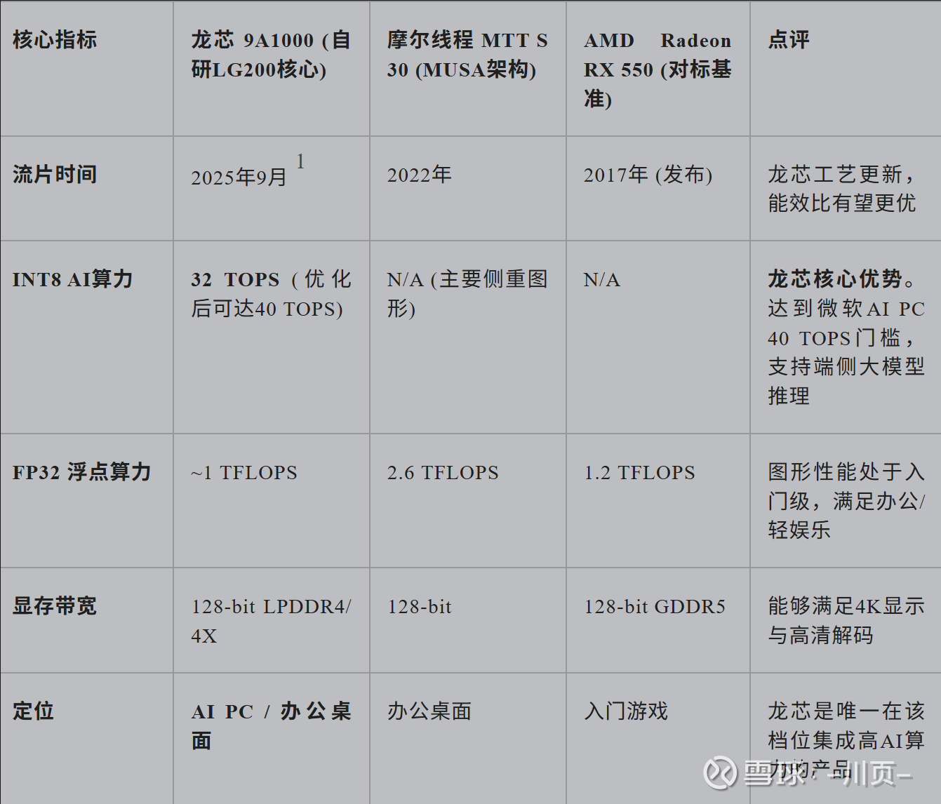 表1:龙芯9A1000与同类入门级GPU参数对比