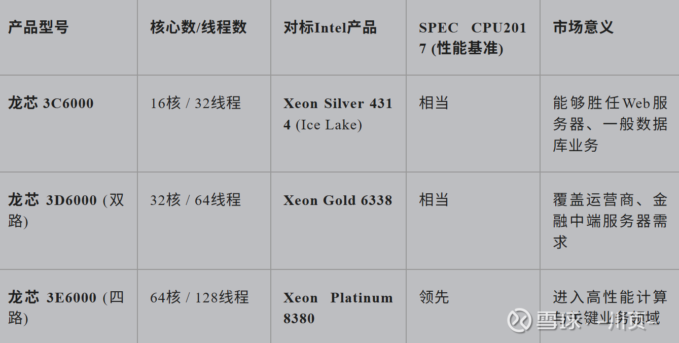 表2:龙芯3C6000与主流服务器CPU性能对标