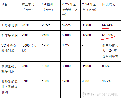 结合公司2025年前三季度已披露数据及第四季度预测数据,全年净利润汇总及同比去年增长64.74% 见下表: