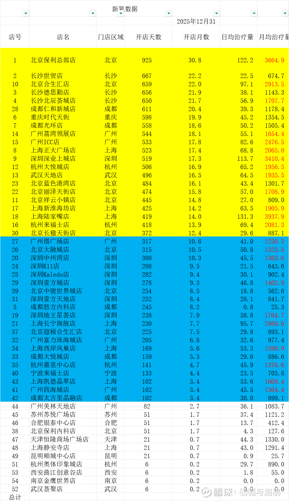 月均治疗量,10家超过1000,还有6家超过800,其中有上海长宁旗舰店2869,上海西岸凤巢店1598,上海凯德晶萃店1609,深圳地王星荟店1764,北京大融城店1523。5家店更是已经超过1500;。