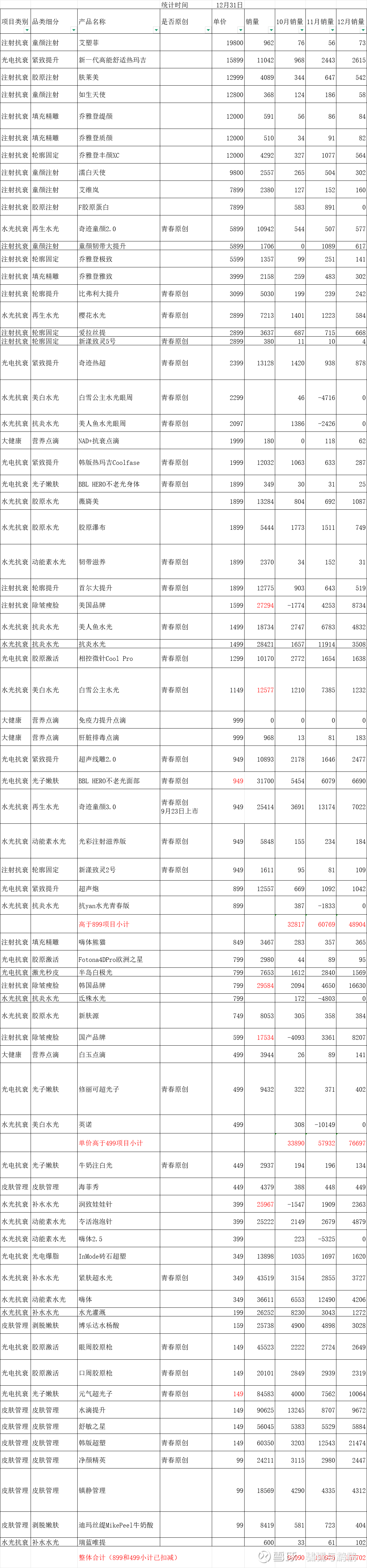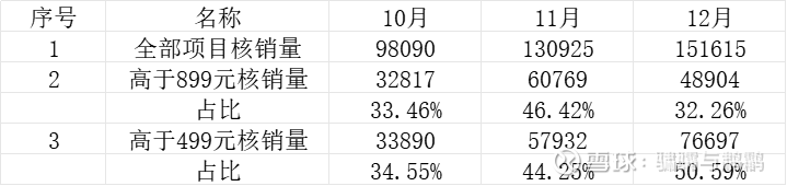 10月底,范冰冰到新氧做了BBL面部项目,所以直接把BBL项目月销2000左右,11月销量提升到9874,同时也带动了不少其他高端项目,所以11月的高端(899元以上)数据显著增长。