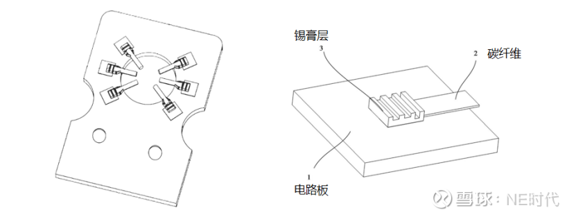 先说背景问题:电机轴高速旋转时,会因为电磁感应等因素产生轴电压,一旦这个电压超过轴承油膜的绝缘能力,就会击穿油膜形成轴电流,电流会在轴承滚道和滚动体上打出小凹坑(也就是电蚀),加速轴承磨损甚至直接损坏;而传统解决办法是用专用模具把碳纤维束压接成模块,再通过固定器和电路板连接来导出轴电流。专利表述的这种碳纤维与电路板焊接的固定方法,新就是让碳纤维能直接焊接在电路板上,不用额外的固定器,同时保证轴电流能稳定导出、避免锡液外溢损坏碳纤维。