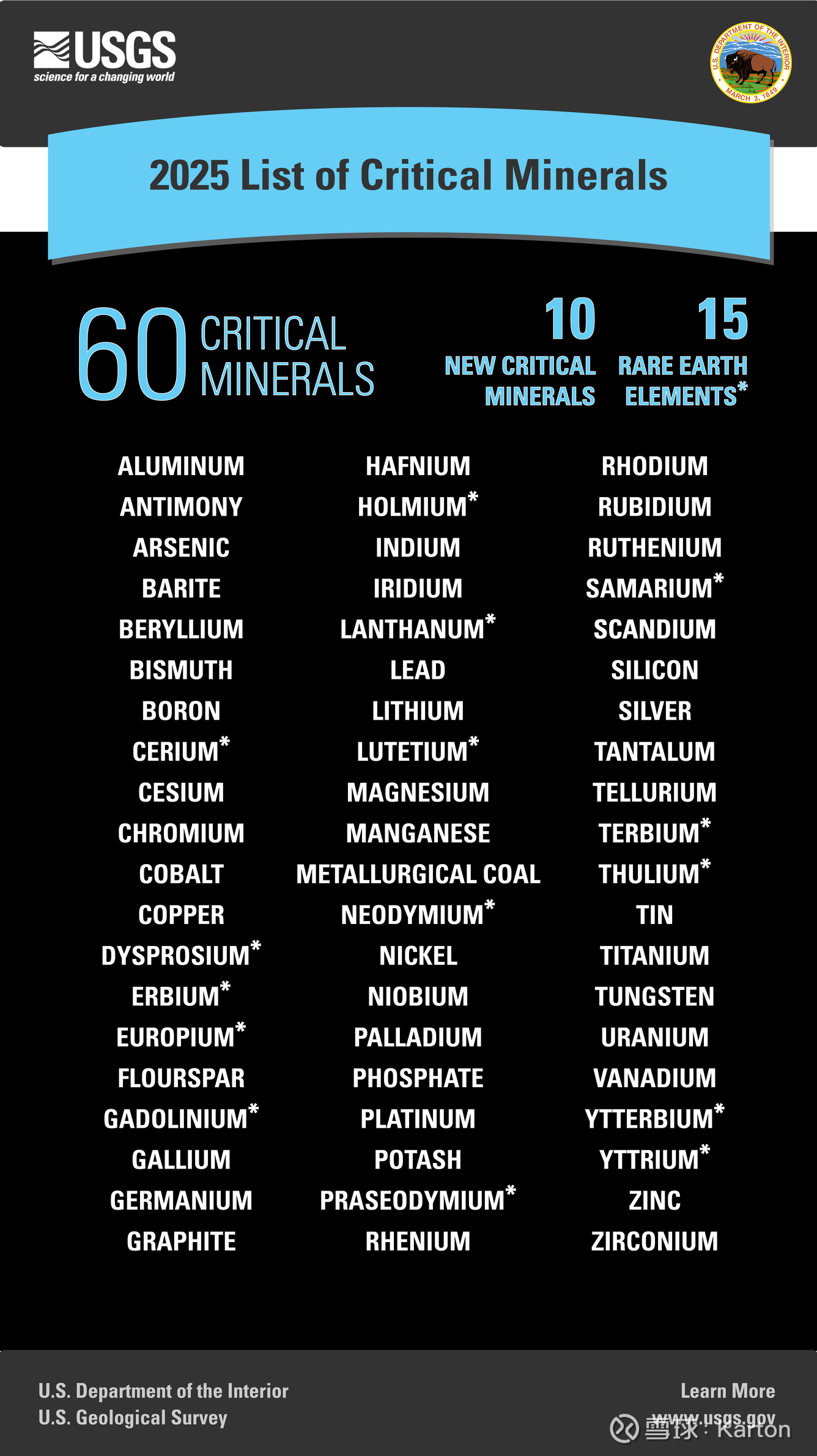 同日,美国内政部下属地质勘探局(USGS)正式公布新版《关键矿产清单》,这是自 2018 年清单首次发布以来最重大的调整。
