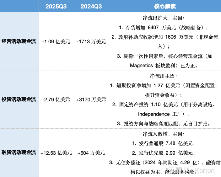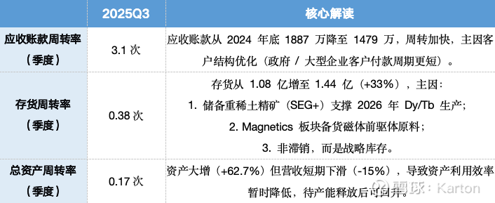 原料协同:Magnetics 板块的磁体前驱体原料完全来自 Materials 板块的 NdPr 氧化物 / 金属,避免外部采购的价格波动与供应链风险,2025Q3 Magnetics 2190 万美元收入中,原料成本可控性显著优于外购模式;