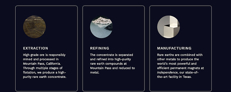 磁体产能落地:Independence 工厂计划 2025 年底实现 NdFeB 磁体商业产出,当前 Magnetics 板块已盈利,证明下游环节的商业可行性,财务数据验证战略决策正确性。